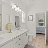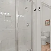 The primary suite offers a private sanctuary, complete with a custom-built closet system designed for optimal organization. Two additional bedrooms share a convenient Jack-and-Jill bath, while a fourth bedroom is thoughtfully positioned near a full hall bath, perfect for guests, a home office, or flex space.