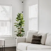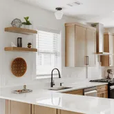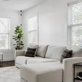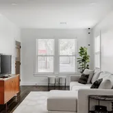 The residence opens to a luminous living and dining area, featuring polished hardwood floors, a new sheetrock ceiling, and custom lighting that creates an atmosphere of refined ease. The kitchen, renovated in April 2025, boasts hardwood cabinetry with soft-close hinges, quartz countertops and backsplash, stainless steel appliances, tile flooring, and Sherwin-Williams Pure White finishes. Every detail has been considered, from updated electrical brought to code to elegant window treatments and a custom back door.