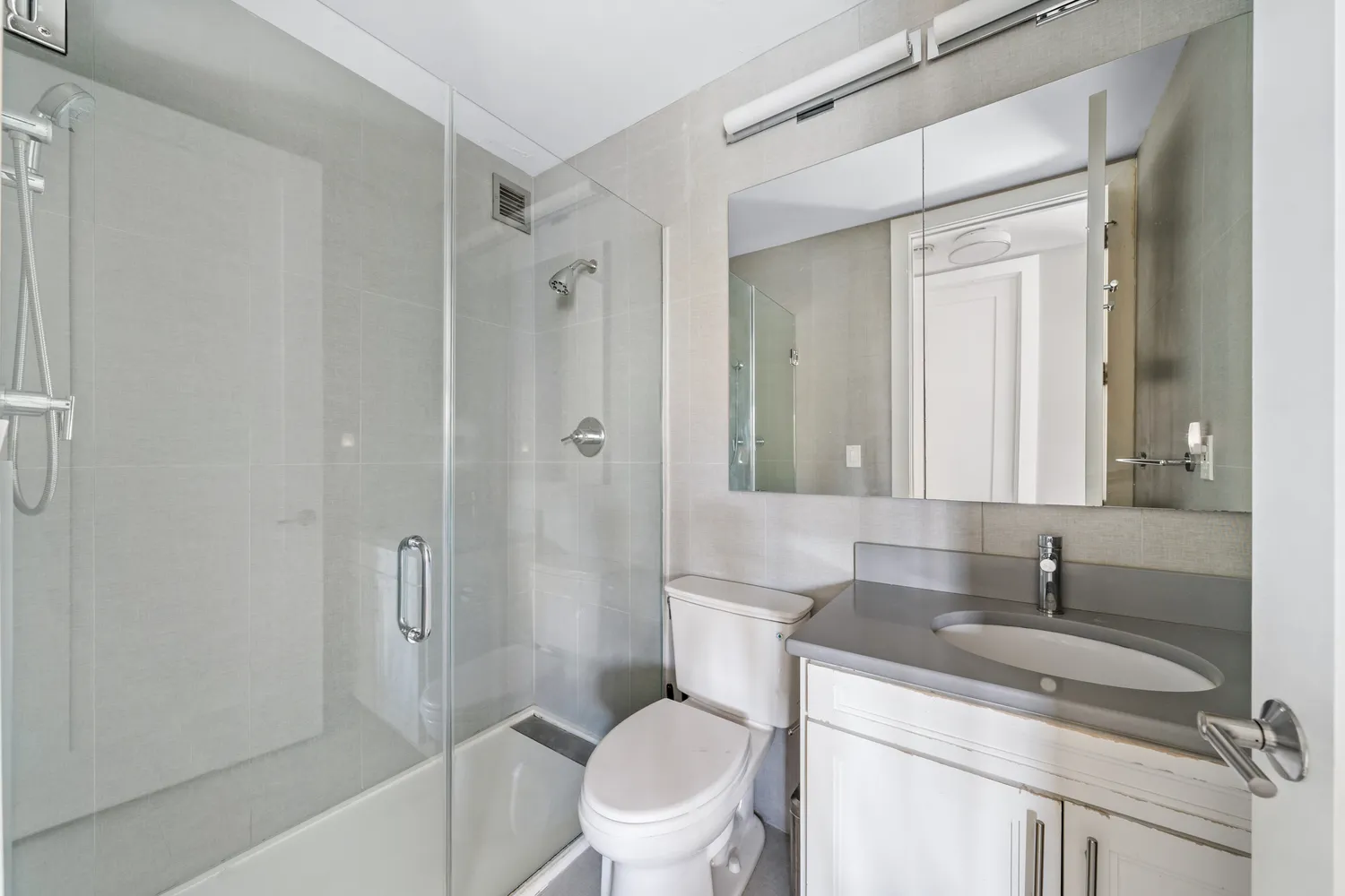 The luxurious bathroom is a true sanctuary boasting a stall shower and Robern medicine cabinets with multiple outlets, ensuring convenience and functionality.
