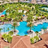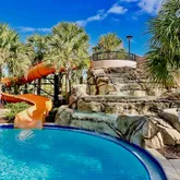 Resort-style beach-entry pool with water slides,