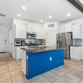 - Room Description: Large kitchen island, with blue shiplap it has granite counters and a stainless-steel double sink with a modern high-arc faucet. White shaker cabinets reach the ceiling, complemented by a grey subway tile backsplash. The space features stainless appliances, including a French-door fridge and glass stove top electric stove.