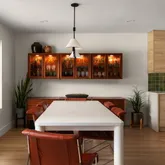 Curb appeal was enhanced with new board-and-batten siding, fresh exterior paint, and a reimagined entryway featuring a glass block window and hand-carved salvaged front door.