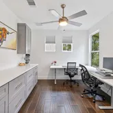 Turn-key and impeccably maintained, the home showcases custom window shades and designer drapery throughout, added garage shelving, and the rare option for furnishings to convey—truly the icing on the cake. The well-designed floor plan includes three bedrooms, two and a half baths, and a charming office nook off the kitchen that overlooks a private greenbelt, creating a timeless and tranquil setting.