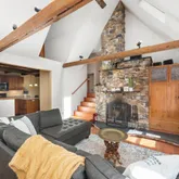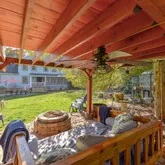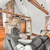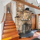 Walk into the inviting foyer, the main level offers a large primary suite with electric fireplace/walk-in-closet/and ensuite bathroom, a second bedroom and bathroom with a claw foot tub, laundry room, dining room with plenty of windows overlooking your garden, a stunning living room with exposed beams and cathedral ceiling plus a stone fireplace, and an open kitchen with SS appliances, granite countertops, pantry, gas stove, and breakfast bar.