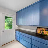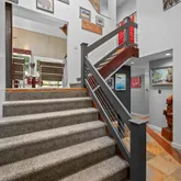 Step inside to a dramatic split-level foyer, where your journey begins. Head upward to the heart of the home or downward to a thoughtfully designed lower level. Immediately to your right, you’ll find three spacious bedrooms, including a flexible space currently used as a home office, as well as a generous laundry room complete with custom storage, built-in drying racks, and folding areas—designed with daily living in mind.