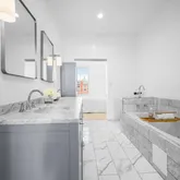 Upstairs, youll find two spacious bedrooms and a stunning primary suite with vaulted ceilings, a skylight, and another exposed brick wall. The primary ensuite bathroom offers a spa-like retreat with a glass shower, soaking tub, double sinks, and luxurious marble finishes.