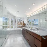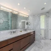 - Room Description: Spacious bathroom with custom Italian marble walls and floor, glass shower and whirlpool tub, heated towel rack and double sinks, separate 1/2 bath with bidet