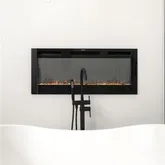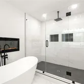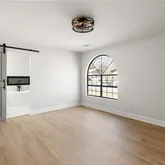 You’ll love cooking and entertaining in the brand new eat-in kitchen with quartz counters, brand-new stainless-steel appliances, subway tile backsplash, vent hood, and ample storage. Upstairs, the spacious primary suite is accented by a stunning arched picture window and a spa-like bathroom where a freestanding soaking tub sits beneath a sleek wall-mounted electric fireplace—creating the perfect ambiance for relaxing after a long day. The oversized glass-enclosed shower features dual rainfall and handheld showerheads, inset shelving, and designer tile.