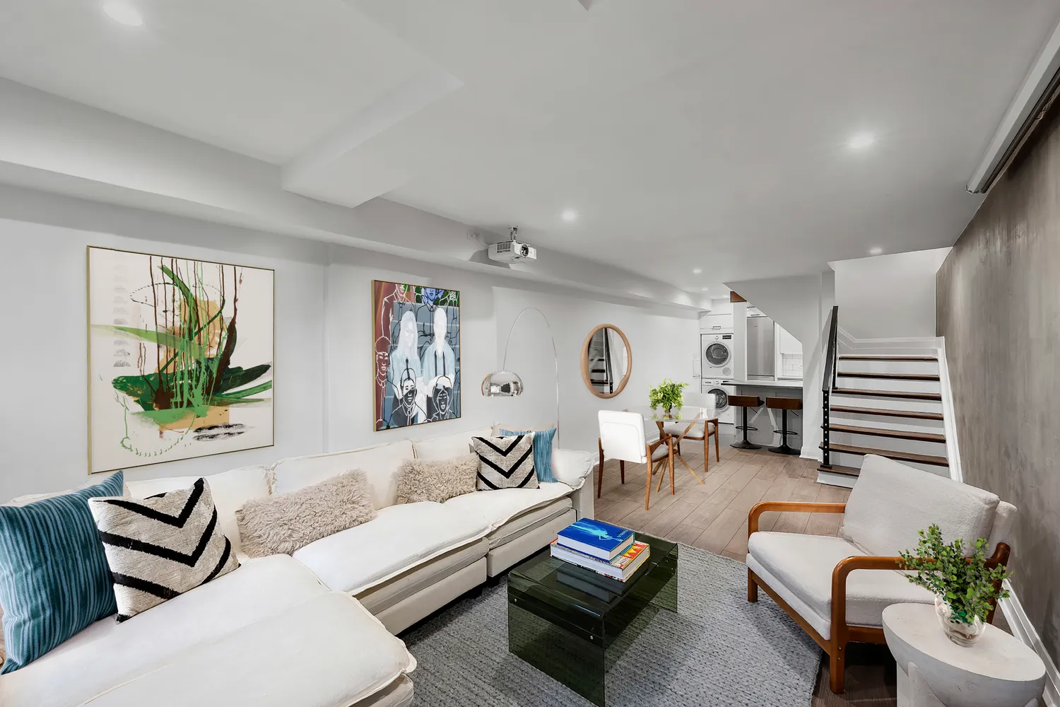 Descending to the garden level, you'll find an open-concept living, dining, and entertaining space. The fully renovated kitchen is equipped with top-of-the-line appliances, including a Bosch Fridge, Miele dishwasher, and Smeg oven. The Caesarstone countertops and a breakfast bar add an additional charm to this timeless space. Lastly, a washer/dryer has been conveniently installed in this area.