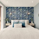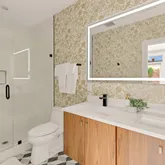 Upstairs, you'll find two spacious bedrooms with custom closets and two full baths, including a sun-drenched primary suite with floor-to-ceiling windows, a Juliet balcony, and a sleek, modern ensuite with a double vanity. A generous third room offers ideal space for a home office, additional guest room, or a luxe walk-in closet. Additional upgrades include Pella windows, designer tile, illuminated mirrors, a stacked Samsung washer/dryer, and updated HVAC and systems; all part of the home’s 2019 top-to-bottom renovation.