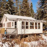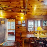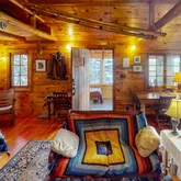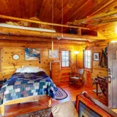 - RoomDescription: One room- living/dining/kitchen/bedroom with wood floor and stone fireplace, small loft overhead.