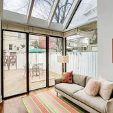 Up the skylit stairs are a front bedroom with crown molding and tall ceilings, a hall bath with tub, skylight and Corian-topped vanity, a convenient washer/dryer closet, and a middle bedroom with a wall of closets, skylight and crown molding. Bright primary ensuite bedroom at rear features a front wall of closets, a rear wall of windows, and an ensuite bath featuring Corian-topped vanity, subway tiled tub, and a skylight. Rest easy knowing the roof is from 2018, and a new washing machine and water heater were installed upstairs in 2020. All windows and sunroom floor convey as is.