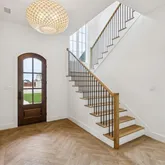 Inside, a light-filled foyer with warm wood flooring and a statement chandelier sets the tone. The staircase features natural wood treads and sleek black balusters, offering a sophisticated transition between levels. The home then opens into a breathtaking great room with soaring ceilings and expansive sliding glass doors that flood the space with natural light and connect seamlessly to the covered patio beyond.