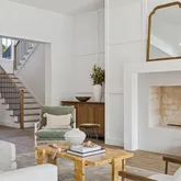 The living area centers around a striking fireplace with tailored wall detailing, creating a focal point that feels both elegant and welcoming. The open-concept layout flows effortlessly into the designer kitchen, where ceiling-height cabinetry, brushed brass hardware, and a dramatic oversized island create a perfect blend of style and function. Professional-grade appliances, double ovens, and abundant prep space make this kitchen ideal for both entertaining and everyday living.