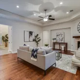 - Room Description: Wood floors, wall of windows, modern stone fireplace, open to kitchen