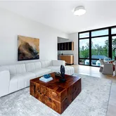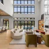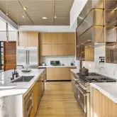 half baths, and approximately 9,200 square feet across three levels, this newly completed residence pairs sculptural architecture with a full suite of resort-style amenities. From its commanding curb appeal and manicured grounds to sleek casement windows with wood-look panels and curated architectural lighting, every detail reflects thoughtful design and modern luxury. Beyond the grand pivot door, soaring ceilings frame a dramatic foyer and family room where a floating steel staircase with motion-sensor lighting becomes the architectural centerpiece. Premium chandeliers, bespoke built-ins, and a striking fireplace set an atmosphere of elegance and sophistication. The state-of-the-art kitchen blends performance and artistry with custom cabinetry, quartzite waterfall countertops, acoustic wood panels, and commercial-grade appliances. A concealed scullery ensures effortless entertaining, while sleek nano accordion doors expand the living space seamlessly to the outdoors.