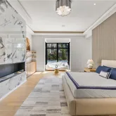 The main-level primary suite serves as a private retreat, complete with bespoke closets and a lavish spa bath featuring a sculptural stone soaking tub, dual vanities, and designer finishes. Upstairs, the secondary suites are equally impressive, each generously scaled with private en-