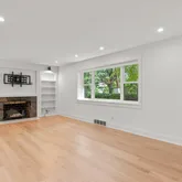 A gracious entry foyer welcomes residents into a spacious living room with a decorative fireplace and custom-built bookshelves, creating an inviting atmosphere for relaxation and entertainment. The heart of the home is undoubtedly the stunning, newly renovated kitchen, featuring an island that serves as both a culinary workspace and a gathering point, and seamless flow into the dining area makes this space perfect for hosting dinner parties or casual family meals. Also located on the main floor is a half-bathroom