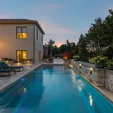 Outside, the backyard is a private resort-style retreat featuring a gorgeous in-ground pool with LED lighting, water features, tanning ledge, beautifully designed travertine tile, a built-in BBQ, another outdoor fireplaces, + professional landscaping w ambient lighting. All outdoor features are easily controlled with state-of-the-art smart home technology—right from your phone.