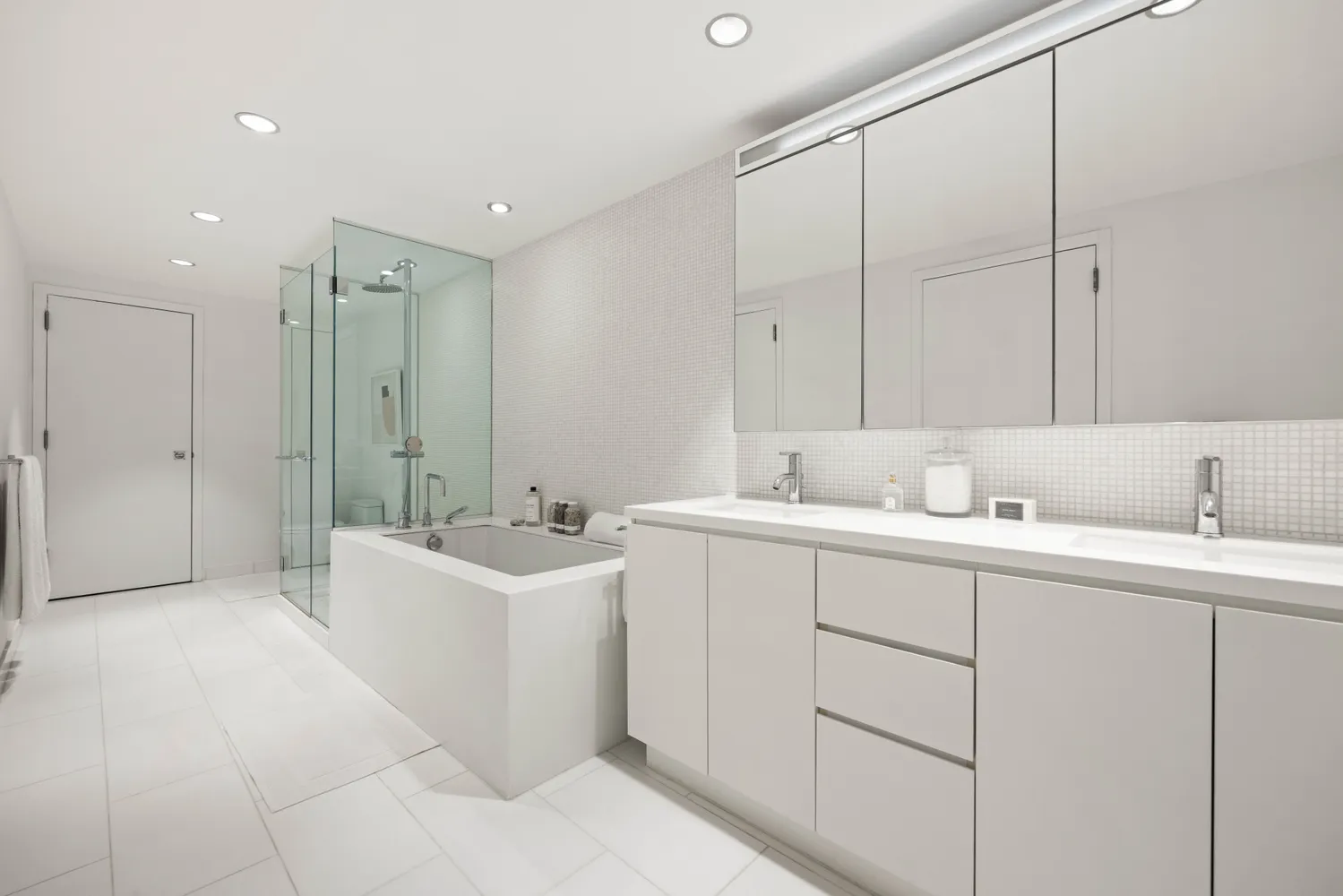 The open-concept layout is designed for both comfort and entertaining, featuring a sleek chef’s kitchen with high-end Miele appliances, a Liebherr refrigerator, and a long kitchen island perfect for casual dining or meal prep. The spacious living area includes a custom built-in unit designed to accommodate a large TV, with extra storage for added convenience. Elegant recessed lighting and a Mirage surround sound speaker system enhance the ambiance.