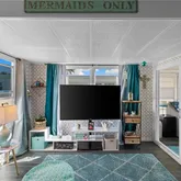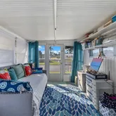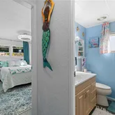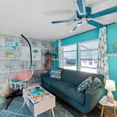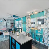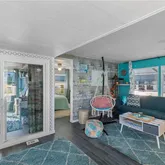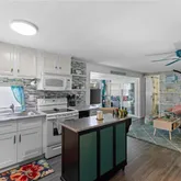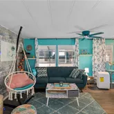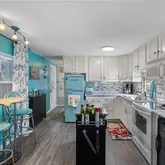 Inside, an open living, kitchen, and dining space showcases Taj Mahal marble countertops, new coastal luxury vinyl plank flooring, and a retro-modern Galanz fridge + freezer combo. New AC ductwork and added insulation beneath the floors provide improved efficiency and peace of mind.