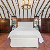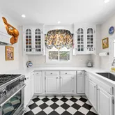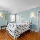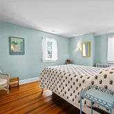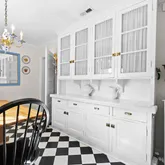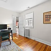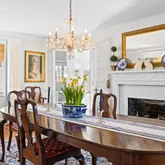 On the main level, you'll immediately be embraced by the warmth of historic charm. A stunning formal living room or lounge, framed by dramatic chestnut beams, features a gorgeous plaster wood-burning fireplace. French doors open to a serene rear patio—perfect for relaxing with a cocktail or entertaining guests. The formal dining room, complete with its own fireplace, is cozy yet refined, ideal for intimate dinner parties. The kitchen has been updated with timeless finishes including neutral cabinetry, quartz countertops, stainless steel appliances, a gas range, and picturesque backyard views. A breakfast nook with original built-in cabinetry and an antique servant’s bell adds character and a nod back to yesteryears. While the home offers several elegant formal spaces, it also includes a comfortable family room where you can unwind with loved ones. And finally, the classic Guilford sunroom with terracotta floors, wraparound windows, French doors leading to the backyard, and a full bathroom—offers incredible versatility and could even be a main level bedroom.