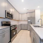 Step inside and be delighted to find a light-filled floor plan with contemporary finishes with a seamless connection between the main living areas. The kitchen was thoughtfully designed with quartz countertops, stainless steel appliances, modern shaker-style cabinetry, and a large island overlooking the living space.