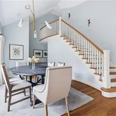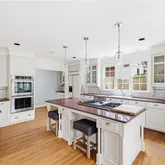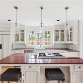 The kitchen is thoughtfully designed with custom cabinetry, complete with a large island, abundant storage, and...This stunning Tudor pairs classic architectural details with generous, light-filled living spaces designed for everyday comfort and effortless entertaining. Inside, a striking curved staircase makes an impression in the formal dining room, framed by a large bay window.