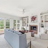 A classic living room with a fireplace opens to a side sunroom, a flexible space perfect for reading or morning coffee.