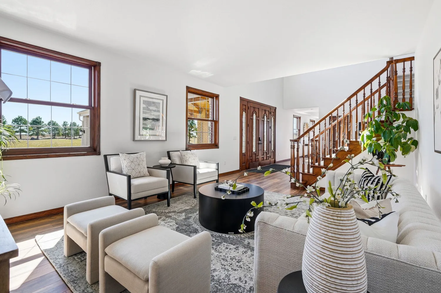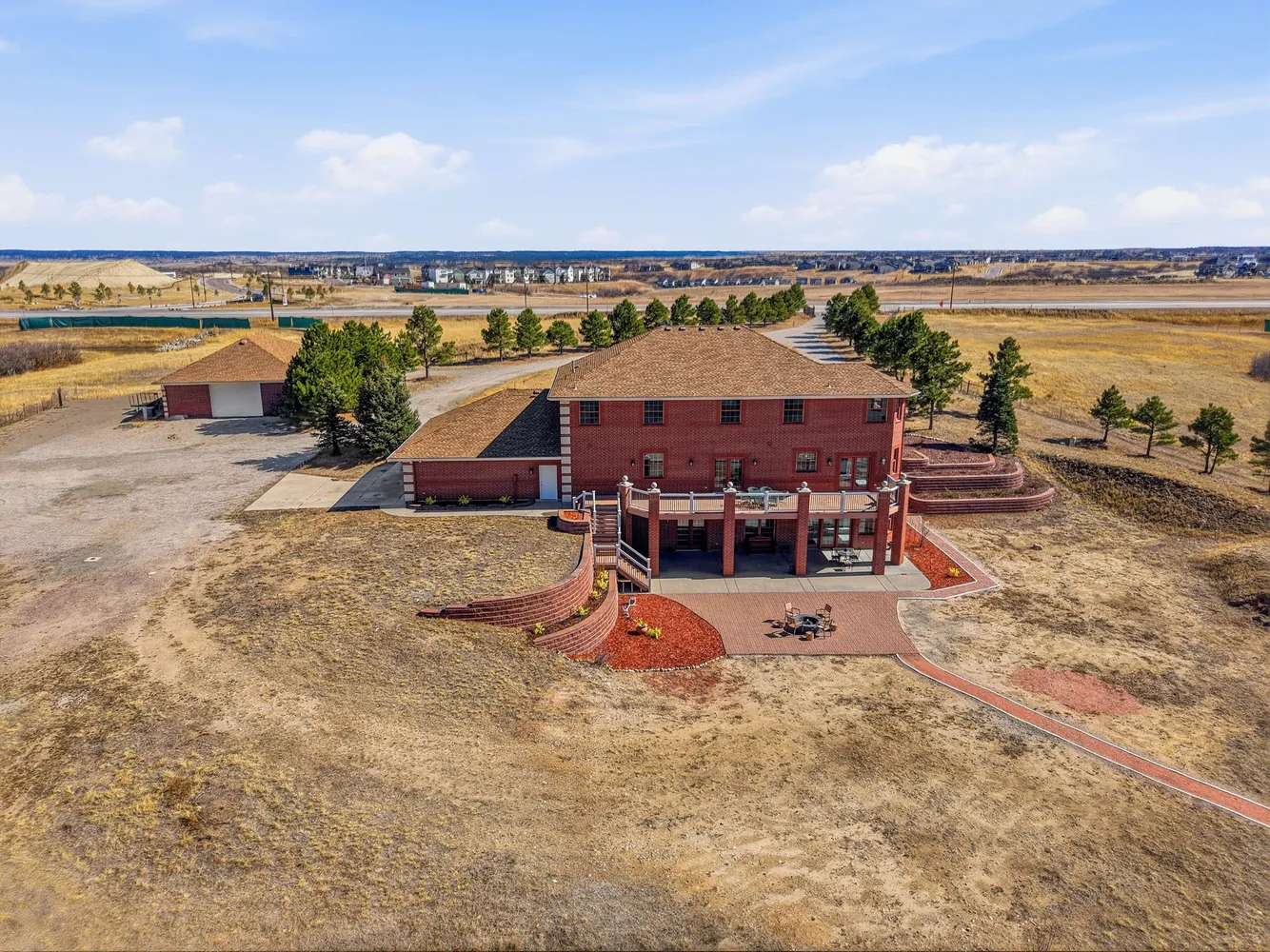 The fully remodeled brick residence features five bedrooms, a dedicated office, and thoughtfully updated interiors throughout, including new flooring, lighting, plumbing fixtures, and a reimagined kitchen and baths. A dramatic two-story entry is anchored by a statement chandelier...Set on 33.5 acres with sweeping panoramic views, this nearly 7,000 sq ft estate offers a rare blend of privacy, usable land, and everyday convenience—just five minutes from Target, grocery stores, and amenities in Castle Rock.