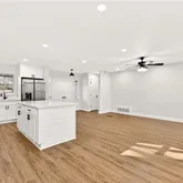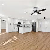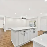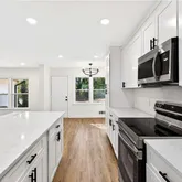 - Kitchen Features: Cabinets White, Kitchen Island, Stone Counters, View to Family Room