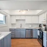 - Room Description: Updated kitchen with white subway tiled backsplash, stainless steel appliances, wood floors, updated lighting, quartz countertops