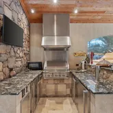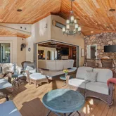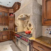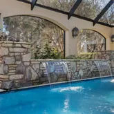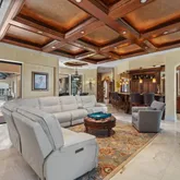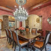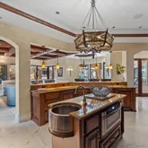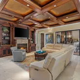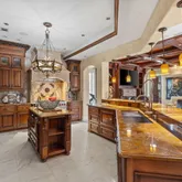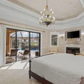 The primary suite is a majestic retreat with lake views, a fireplace, an expansive closet, a gold-crusted chandelier, and an immersive bath. Additional highlights include a world-class office, a gourmet kitchen in a league of its own, and an outdoor living space with a tremendous pool and water features. The property also includes a full three-car garage with ample parking for guests and citrus trees that produce lemons for summertime lemonade.