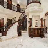 Upon entering the home, you're greeted with Calcutta marble flooring, and a tranquil indoor water feature that's framed by a 15' barreled ceiling. The fresco-painted dining area exudes