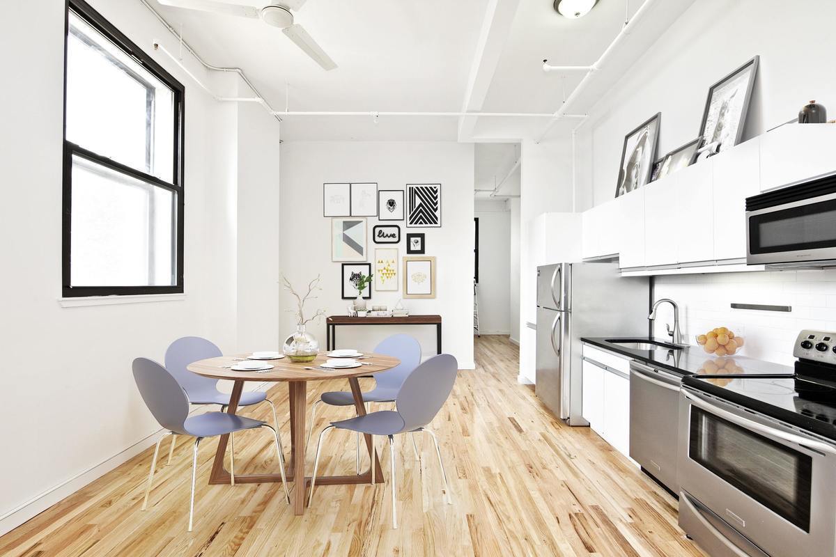 Modern art gallery minimalism meets 20th century industrial New York in this historic former tonic water factory, creatively reinvented as the 44 Berry Building. Loft-like living in Williamsburg.