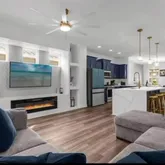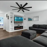 Two living areas, including a large family room with flat-screen TV and brand-new sofas