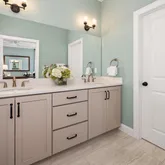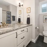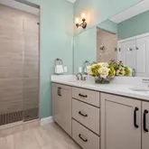 - Room Description: Porelain tile flooring; baseboard molding; double vanity with quartz countertop and backsplash, vanity lights (2), and wall mirror; shower/tub combo with shower insert; ceiling exhaust fan with light