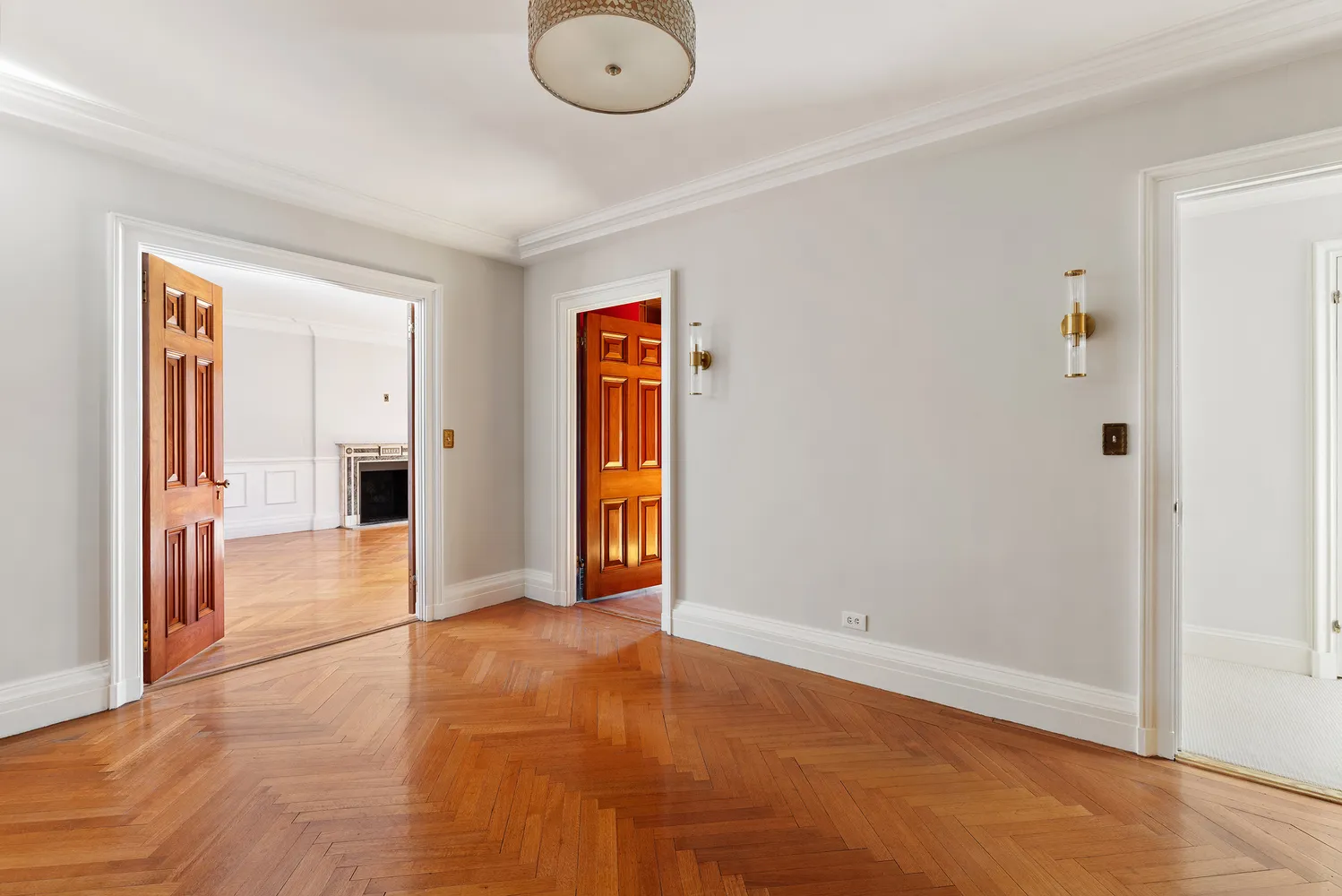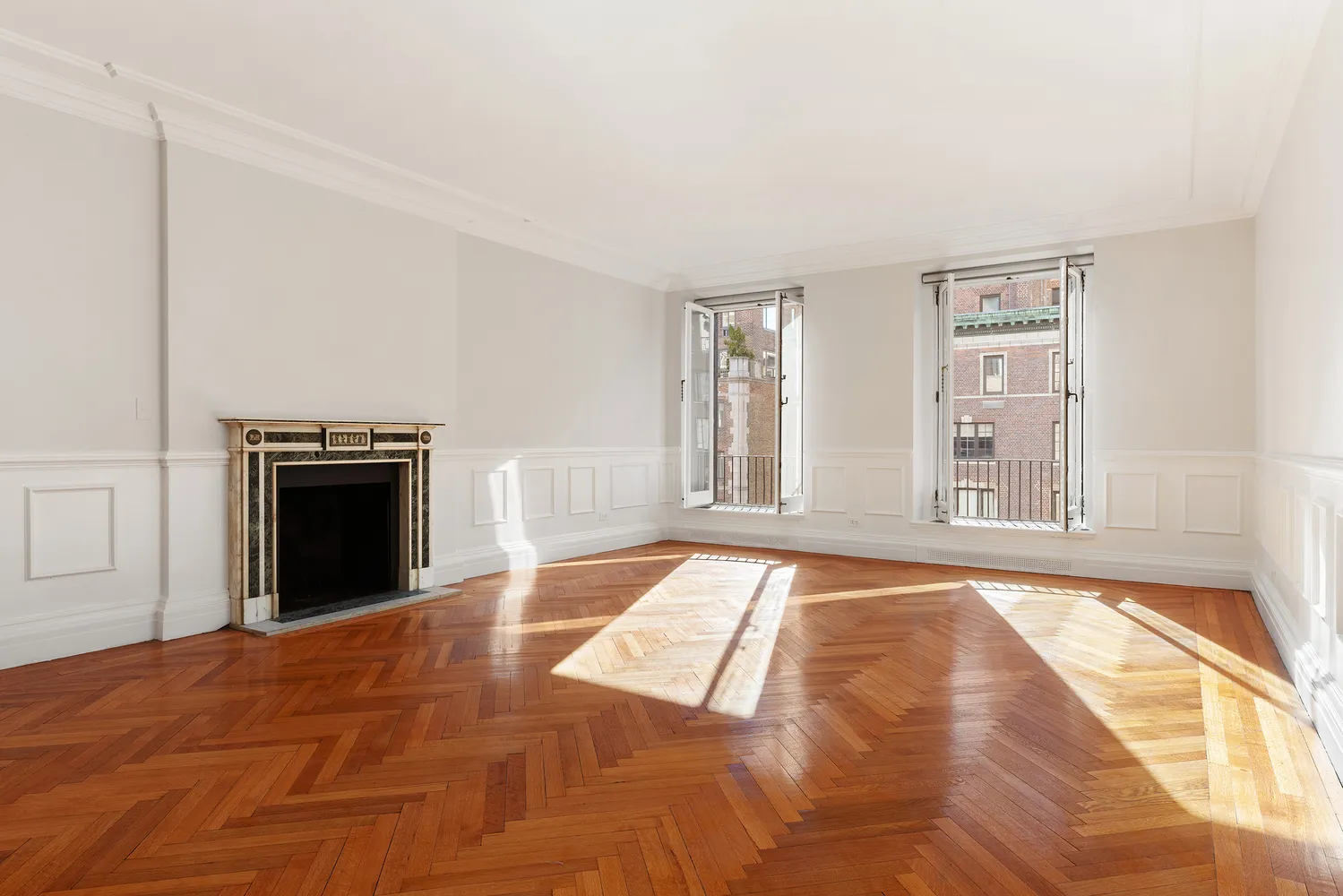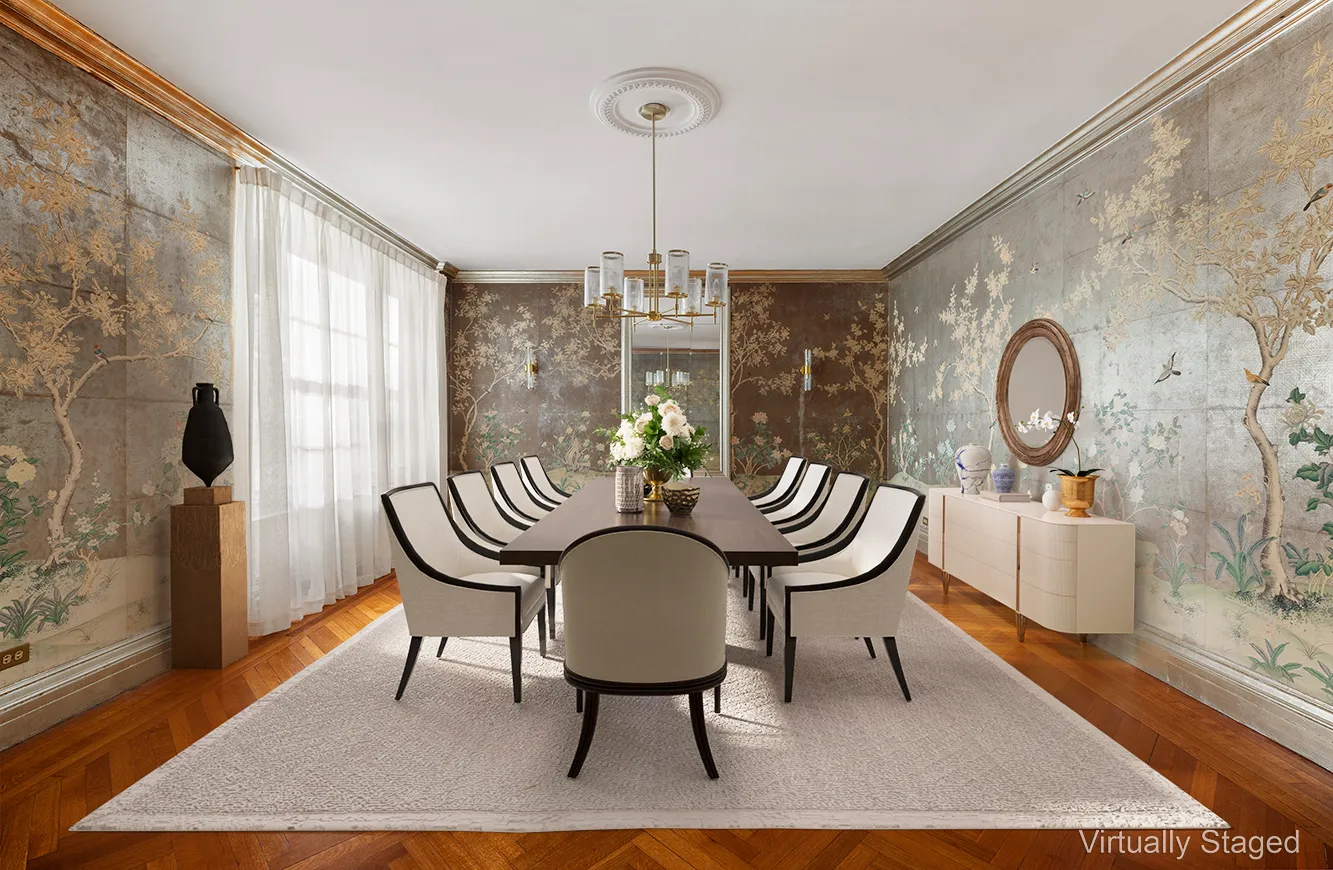Bright sun envelopes this 4,100+ SF home, pouring in from the south through floor-to-ceiling french windows, illuminating the restored original details as designed by famed architect Rosario Candela. The apartment combines the best of contemporary and old-world elements. The wood paneling and herringbone floors have a gorgeous warmth that are echoed by the apartment's other original features like stunning marble fireplace mantles and substantial brass hardware.