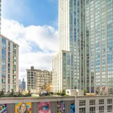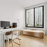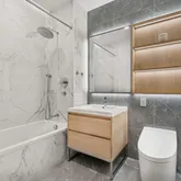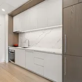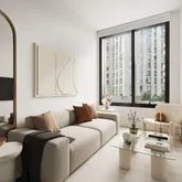 Designed by Lemay+Escobar, Residence 4G offers a bright and efficient layout with southwest-facing floor-to-ceiling windows and 9’11” ceilings. The interiors are finished with white oak engineered wood floors and a LATCH smart entry system for added convenience. The custom kitchen is equipped with white cabinetry, Bosch appliances, an induction range, quartz countertops, and a deep under-mount sink. The bathroom features polished porcelain floors, a custom millwork vanity, and a Neorest Automatic toilet. A Bosch washer and dryer are also included. Building Amenities