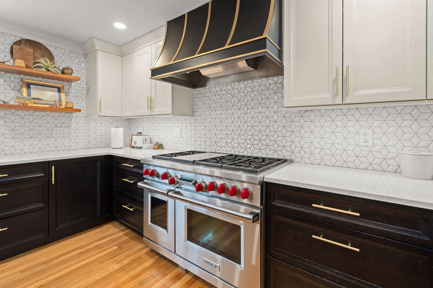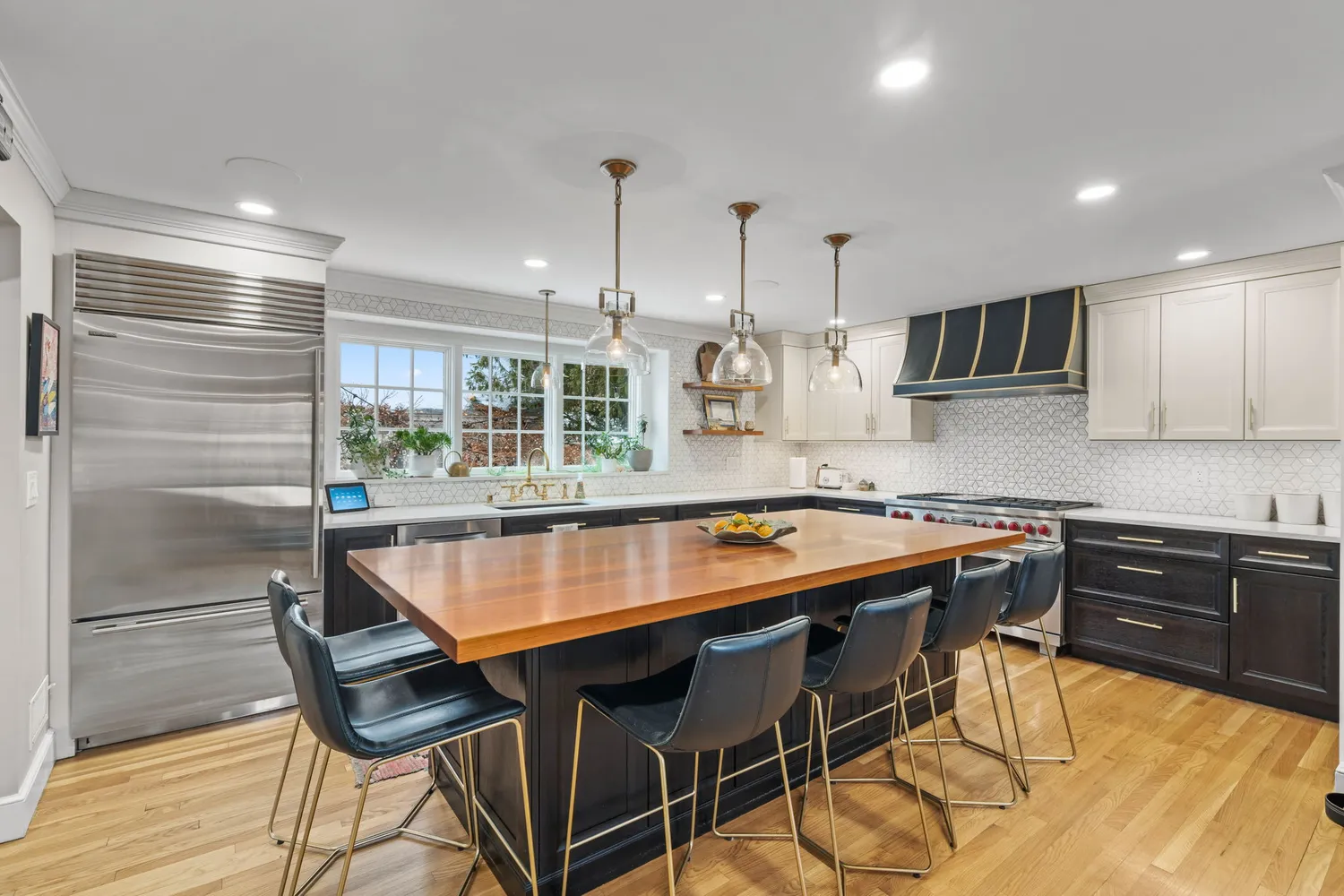 The heart of the home is the stunning chef’s kitchen, designed to impress any cooking enthusiast. It boasts premium quartz counters, a large island for prep or entertaining, a convenient pantry, a sleek range hood, stainless steel appliances, and ample workspace. Gorgeous hardwood floors flow throughout, enhancing the warm and inviting ambiance.