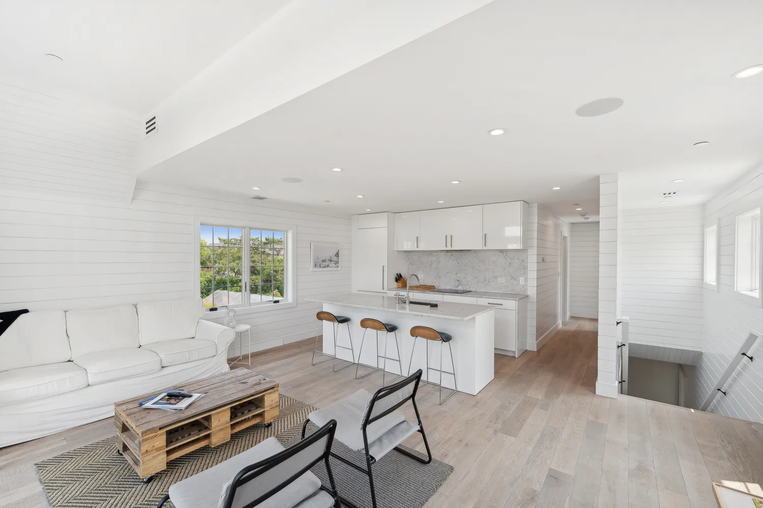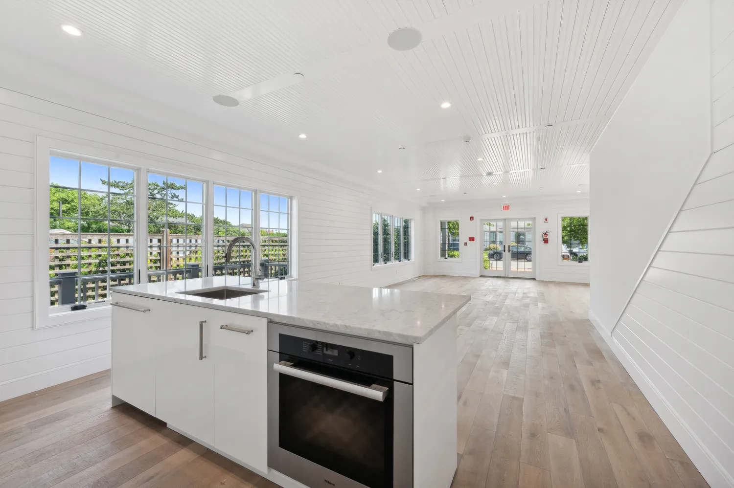 The main level features a beautiful great room with an open kitchen, complete with a large center island, Miele and Wolf appliances, and white Carrera marble countertops. This level also includes a versatile open commercial-use area suitable for living, retail, office, or other purposes. A powder room with Lefroy Brooks fixtures and a private bonus area add to the main floor’s appeal. Sliding glass doors lead to a private deck that overlooks Fort Pond and the rear of the property.