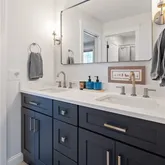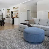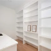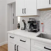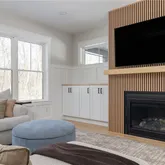 finishes, natural wood, and other details throughout. A generous foyer welcomes you into the home, along with a stylish first floor office and conveniently located half bathroom. The first floor is open and inviting as you continue into a chef's-kitchen featuring custom cabinetry, Thermador appliances, wet bar and hidden butler's pantry; along with a large adjacent dining area. The main level is complete with a light-filled living room with stylish feature wall and custom gas fireplace.