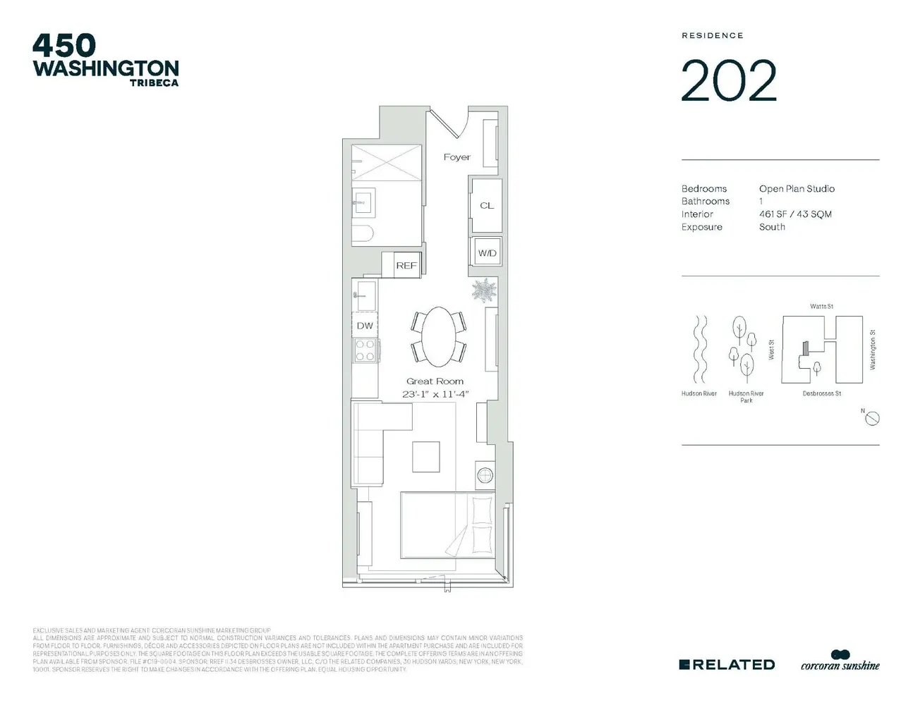 Located along Tribeca's historic waterfront and the spectacular Hudson River Park, 450 Washington by RELATED is a beautiful property with 176 perfectly-detailed residences. Where sun, water and parks meet downtown, 450 Washington features a private...Residence 202 | Courtyard Studio