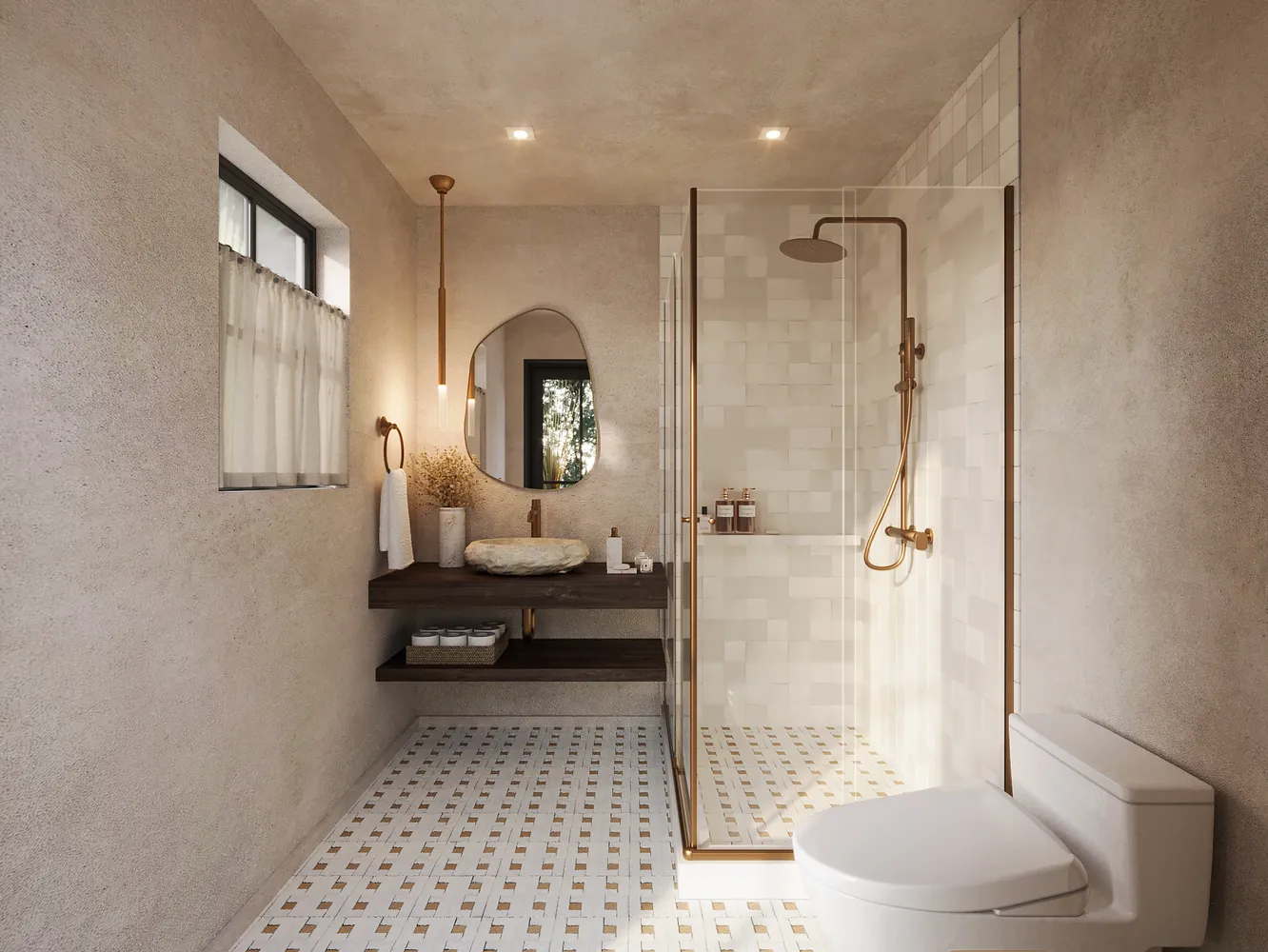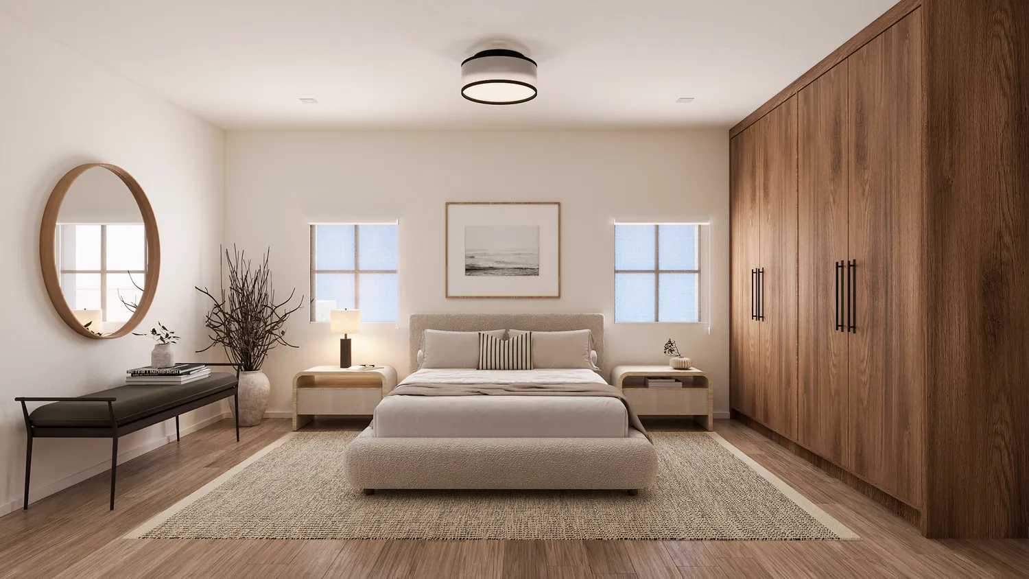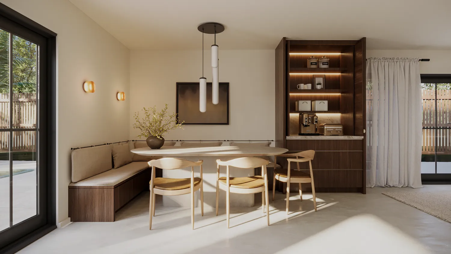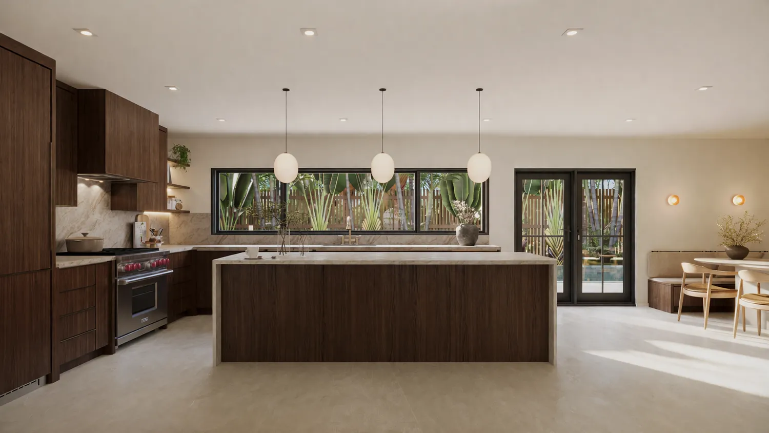 Upon entry, you’re welcomed into a gracious living space with seamless sightlines to the backyard, anchored by an impressive 13-foot-wide kitchen window that floods the home with natural light. Exposed wood beam ceilings and arched windows add warmth and timeless architectural character throughout. Designed for both everyday living and entertaining, the kitchen showcases an oversized waterfall island, premium appliances including a Wolf gas range and Sub-Zero refrigeration, and a charming corner banquette.