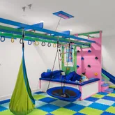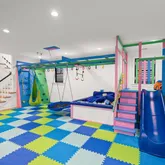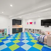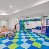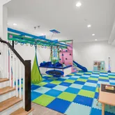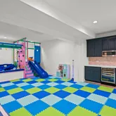 The lower level is a true standout -- a custom indoor playground designed for imagination and movement, complete with a treehouse, slide, monkey bars, climbing walls, and trapeze. It is a one-of-a-kind space designed to delight ages 0 to 99.
