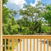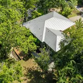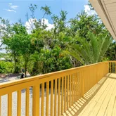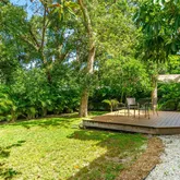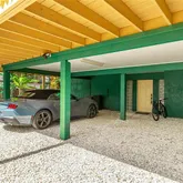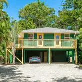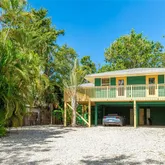 Additional features include an elevated structure with a gravel driveway, generous covered parking and storage beneath the home, tropical landscaping with low-maintenance outdoor space, and thoughtful artistic touches throughout.