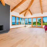 - Living Room Features: Cathedral/Vaulted, Deck Attached, Open Beam Ceiling, View
