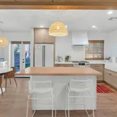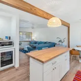 exposed wood accents, sleek quartz countertops, pristine wood flooring, and