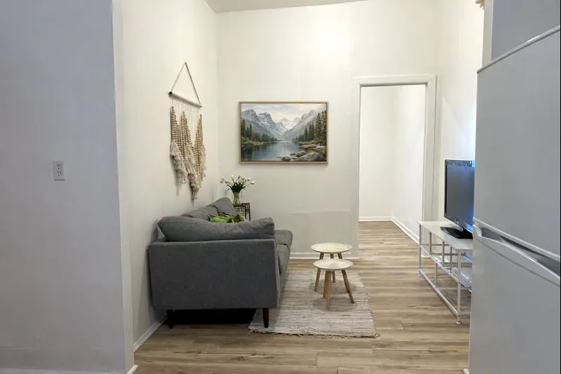 The open-concept kitchen and living space feel open and airy. The bathroom includes a bathtub and is flanked by a generous hallway closet. Off the living room is an additional room that can easily be used as a home office, nursery, den or walk-in closet! The sunny bedroom comfortably fits a queen-sized bed. Pre-war charm shines through with a decorative fireplace and the room includes a nice closet.