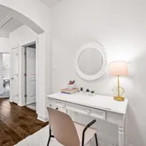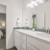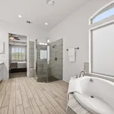 - Room Description: Spacious bathroom with a dual vanity featuring a stylish quartz countertop, a garden tub, a separate shower, and a makeup nook, leading into a large California-style walk-in closet.
